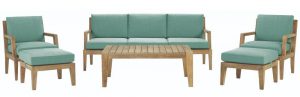 1. A Bermuda 6 piece All weather wood patio seating set with Spa blue fabric with woodsy vibes equally appropriate for seating many more guests as possible at the table in the dining area, as a perfect alternative around the garden, or a swimming pool beside for a comfortable and blissful seating area.