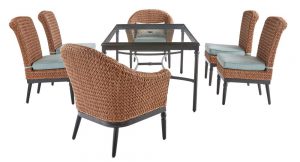 10. A Camden 7 piece seagrass light brown wicker outdoor patio dining set with sunbrella cast spa & fretwork mist cushions with polished chrome legs – ideal for wide living spaces but also have a decent amount of leg space, where seven can be seated.