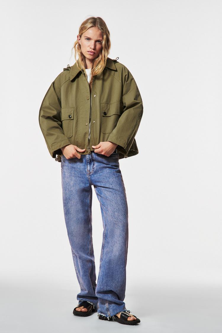 Collared jacket with a detachable hood. Featuring long sleeves, front patch pockets with buttoned flaps and adjustable asymmetric hem.